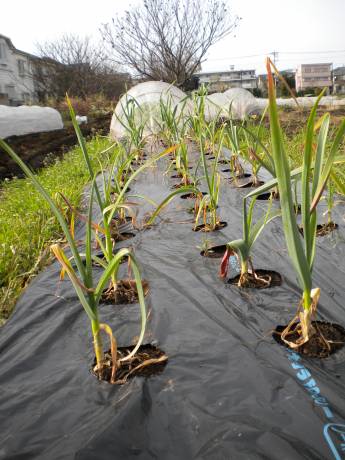 At home I used mulch to keep weeds down and the ground moist, but here I've seen it's value for those reasons and more. The wind as it whips across the farm and over Tokyo is most impressive, and not just in typhoon season. I see great gobs of topsoil flying away sometimes as we're working, so I've decided to give in to the plastic for now. I'm also experimenting with NOT weeding the paths. Fukuoka in The One Straw Revolution worked with his "weeds", and I thought perhaps I should give it a go, too. I've "mowed" them a couple times to keep them from going to seed, and used their bits for a top layer of mulch in the wall bed. I'm hoping all of these efforts will help hold the soil down in high winds and heavy rains, and in the case of the wall bed, feed the soil, too. I'm a little concerned the weeds are robbing my garlic of nutrients, but it's a bit of a rock and a hard place.