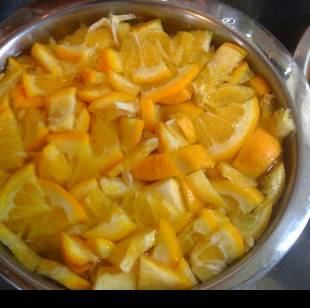 The recipe is, as she states on her blog, more of a formula than a recipe. I like it because it's flexible and easy on the sugar. Well, and because it makes a super-tasty marmalade, of course! Perfect work for a wet Spring morning.