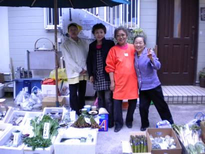 A little further on we almost missed some lively ladies selling sansai (mountain vegetables) on a side street. Gathered around boxes full of a lovely assortment of greens and pickled vegetables these four ladies were worth the detour in themselves. Highly entertaining and enthusiastic purveyors of these Japanese wild food favorites, they offered tastings as well as cooking instructions. Vegetables on offer included some I'd met before while travelling with One Life Japan - fuki, warui, and warabi - but a number of others were new - shidokina, koshi abura, and miogadake - and very tempting. We came home with some new and old, along with a container of fuki no tou miso - a pesto like mix of fuki and miso that is simply delectable. This little entrepreneurial group also takes orders, and you can pick up a form when you stop by for a visit!