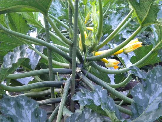 The first two photos show the farmers most beautiful zucchini plants trimmed and producing like mad. The airy structure allows easy access for beneficials, wind, sunshine, and the daily harvest. My zucchini, shown in the third photo, clearly need a bit of a tidy in comparison. The plants look healthy enough, but space could be made to help protect against future troubles. And to make finding those yummy patty pans that much more convenient!