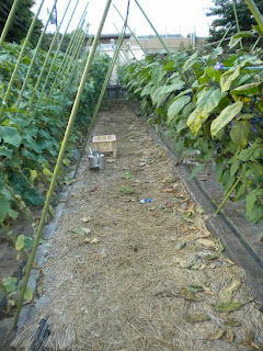Enter this garden. Directly below the plants the gardener uses black plastic mulch, but the paths are covered with woven straw mats. The black plastic mulch would warm the soil for the young eggplants as well as control weeds, and the woven straw mats manage weeds as well as erosion. The first time I saw it the mats were new. Two months later the mats are clearly weathered and a bit worn, but defenitely holding their own.