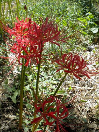 Along with the tulip and crocus bulbs planted last week in the west wall bed I also put in three bulbs of Red Lycoris. This time of year the flowers can be seen everywhere, and in my quest to increase the color and texture of my garden it seemed like a brilliant idea to add them to the mix. They are not one of the seven fall flowers of Japan, but they're fast becoming a new favorite of mine. (Although, I will say I'm simply a fool for flowers so that's not so surprising.) I've been impressed so far by the lantanna and lavender with their staying power for color and texture, and wanted to build on that. Red Lycoris reminds me of Spider Flower (a.k.a. Cleome) in it's bloom shape, but I like it's straight delicate stem more. I also like that's it's leaves will add pleasant green texture to the garden bed, too. I like the idea that folks strolling by find something nice to look at, too, and so I confess that I plant with an audience in mind.