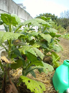 This spring I received a box full of goodness from a woman I met last fall at a Slow Business festival. Inside, much to my delight and surprise, were seeds for fusen and goya, along with Jerusalem Artichoke bulbs and yacon seedlings. Because of her kindness our green curtain was born, Jersulaem Artichoke grow on the balcony, and yacon stand in the garden. (I also had a fair amount of advice from Radix and a handful of other tuber fans in the blogosphere to help me get them happily settled.) Yacon, a tuber from South America, is increasing in popularity here in Japan. With a flavor and texture reminiscent of apples, it is an excellent addition to soup, salad, or a dish of sauteed vegetables. Planted in the west wall bed, they stand about three feet tall. (This photograph was taken in August, and they are taller and more lush now.) I've kept them well mulched with grassy weeds to help ease them through the unseemly heat of summer. Troubled a bit by the heat and drought, and a marauding bunch of katydids desperate for snacks, they're looking quite happy during these slightly cooler days. No flowers yet, but perhaps they are still to come. I imagine harvest will be sometime in the next couple months, and it is then that I hope to save some back for planting next year, too.