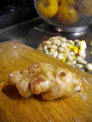 One of the great thrills of a recent hike (other than great views of Mount Fuji and the fun of my companions) was finding a number of vegetable stalls at the end of the trail. (Ok, the monkey's were a highlight, too.) We all came home with yuzu, green tea, umeboshi, a handful of winter greens, and ginger.Well, so we thought. It turns out that what I thought was ginger for the yuzu-ginger marmalade I was dreaming up was something more potato-like. The distinctive ginger smell was lacking, and when I nibbled on them they were firm and sweetly bland. (Luckily for the marmalade I still had some ginger from a local vegetable stand.) These went back in the drawer for further investigation.