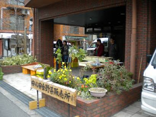 Shoppers find the best the season has to offer each week as it comes fresh from the field. Those not wishing to rush down at 9am when the market officially opens arrange to pick up a bag of assorted vegetables later in the day for a mere 500 yen. A recipe or two is often tucked inside, and the one offered that week was nanakusagayu, a New Year's dish to settle the stomach after a week of feasting. I was a bit envious as I looked at the long onions, chingensai (pak choi), mizuna, and daikon poking their heads out of the bags waiting for owners to arrive. I didn't need any groceries, but they were lovely specimens.