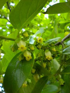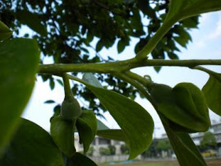 This morning during a lull in activity, I wandered over to get a quick drink of water. Looking up at the kaki's branches, I noticed some small white blossoms surrounded by green leaves that resembled nothing so much as lips. A closer inspection of other branches revealed tiny, tiny kaki just beginning to form. I'd noticed the mini-fruit before, but never spotted them quite so young. Somehow I'm amazed every time.