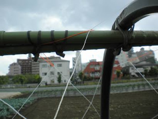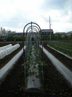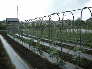 The cucumber trellis is a fairly simple affair erected in just a few hours. Narrow inverted u-shaped structures run along the sides of the bed, spaced roughly every two or three feet. Made from the standard green poles used for everything from staking beans and tomatoes to creating the eggplant's cathedral-like structure, the poles can be seen at farms everywhere here. A little u-shaped attachment fits snugly over the top creating a secure arch. To these a ācross beamā made of the same poles ālinkedā together runs across the center line of the arches. A rubber band with a sort of bobble at the end secures each pole to the arch as well as to the next cross-beam.