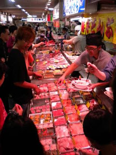 Since this year's visit focused on the eastern coast of the island, we decided it was time to finally sample some of the island's famed fare. A friend recommended visiting Washo Ichiban not far from Kushiro's port. Here a visitor could wander aisles of any number of sashimi vendors to eyeball and choose whatever piece of fish looked the most delectable. A diner might sample the day away trying fish not found in other parts of the country, or in our case never seen before in our little part of the Midwest.