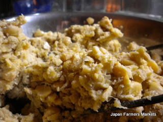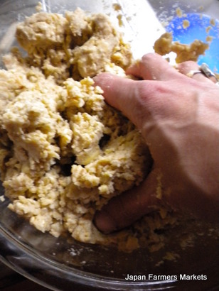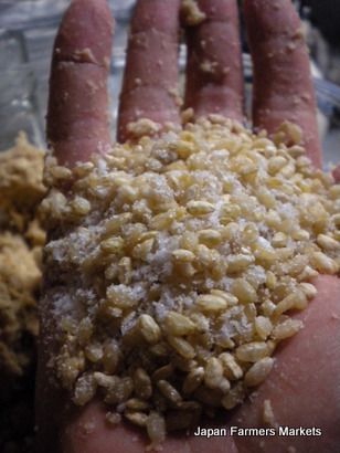 Koji is the yeast that gets busy fermenting and turning the daizu into miso or rice into sake. Word has it that it also makes a mean pickle. Its most common form is as koji-infused rice, which is how Yamamoto Farm sold it. I simply filled a cup or two, poured it over the smashed beans, and started mixing it, literally, by hand.