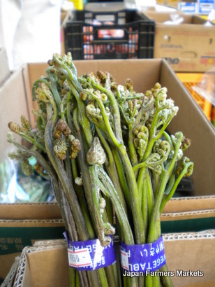 | Bundles of warabi, a type of sansai or mountain vegetable, at the Ibaraki Farmers Market in Roppongi. |