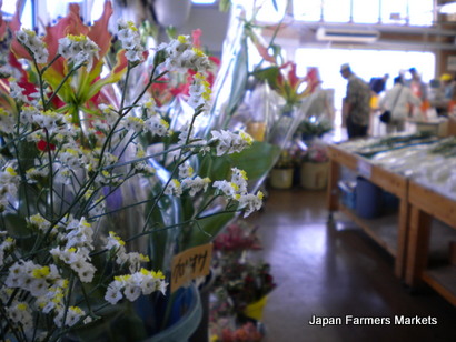 Located in far western Tokyo, the Akigawa Market is a JA market that features produce and products from the surrounding fields and farms. And when I say surrounding, I literally mean 'surrounding.' About a ten minute walk from the Higashi-Akiru Station, the path took us past small houses with little gardens up a hill to find big gardens and farms with houses scattered between. Sweet corn, squash, tomatoes, eggplant along with a cheerful selection of flowers grew as far as the eye could see. A few direct sale stands could be seen, too, along with their farmers working away in an already hot morning sun. The mountains that are normally just a hazy ruffle in the west from our western suburb are clear. Lionel tells me that the plateau we now walk on is lined on one side by the Tama River and on the other by the Tamagawajousui, an Edo Period engineering feat that brought fresh water to Tokyo and turned the Musashino Plain where I live into farms.