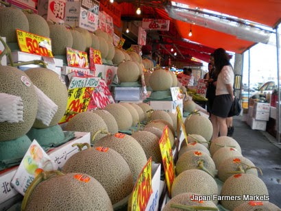 | A lovely line-up of melons at one of Sapporo's regular markets. |