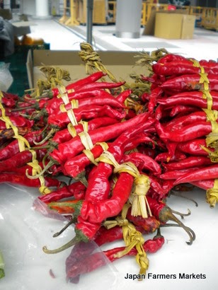 | Drying togarashi braided with wara (rice straw) at the Nippori Farmers Market. |
