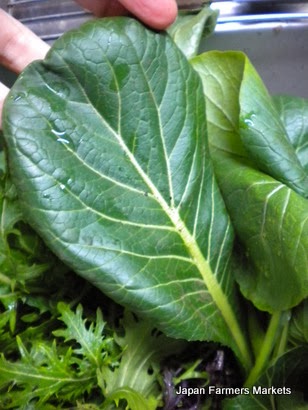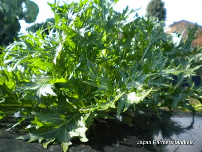 Mizuna, a classic nabe ingredient, can be found nearly year-round now in grocery stores, but is best during the winter months. Long, thin white stems topped with serrated green leaves, mizuna has a delicate, sweet taste perfect in salad or soup. In the field, mizuna grows thickly out from a central base stem. Before being broken up and prepared for the supermarket, plants can resemble haksai (chinese cabbage) in overall shape. If adding it to nabe, toss it in at absolutely the last minute. Too much cooking turns it to mush and it loses all its color, which is not any fun.