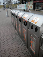 Garbage sorting stations are everywhere in Japan. Train stations, airports, hostels, hotels, and convenience stores all have them, and they dot the campus - inside as well as outside buildings - near where we live. (The photo was taken during a recent bus trip at a highway rest stop, and the picture at left was taken at the university.) It's not difficult to sort and only takes a minute or two at best. And while the system isn't perfect by any means it does give me pause when shopping. (I've switched to a yogurt that comes in waxed cardboard versus plastic, for example.) It's also gotten us to begin carrying our own chopsticks on trips, and not minding the lack of paper towels in public restrooms. (Like Japanese people, we carry a washcloth with us now to dry our hands.)