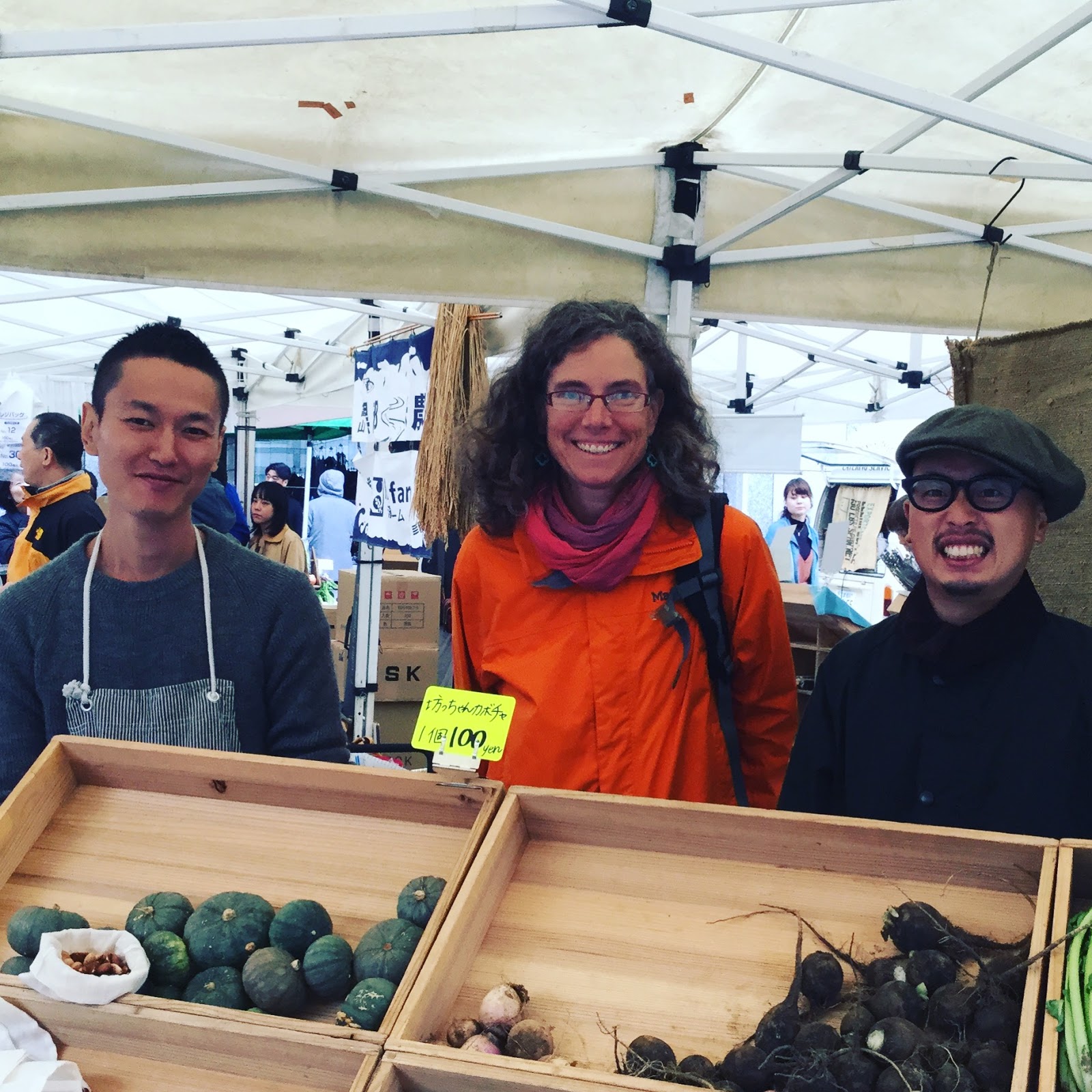 | Kohei Satu, me, and Takuma Ogawa at the UNU Farmers Market last week. Chef-farmers from Chiba, their stall offers some tasty organic veg and no plastic! |