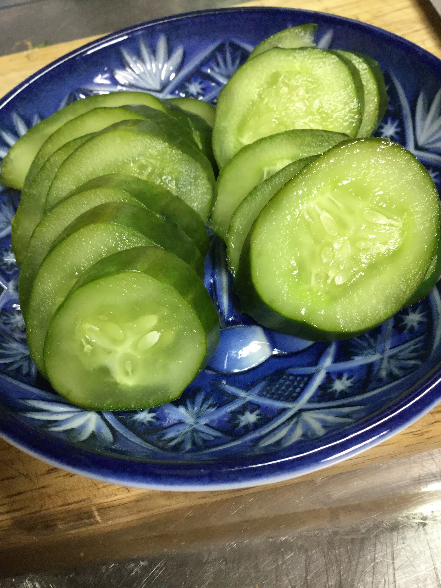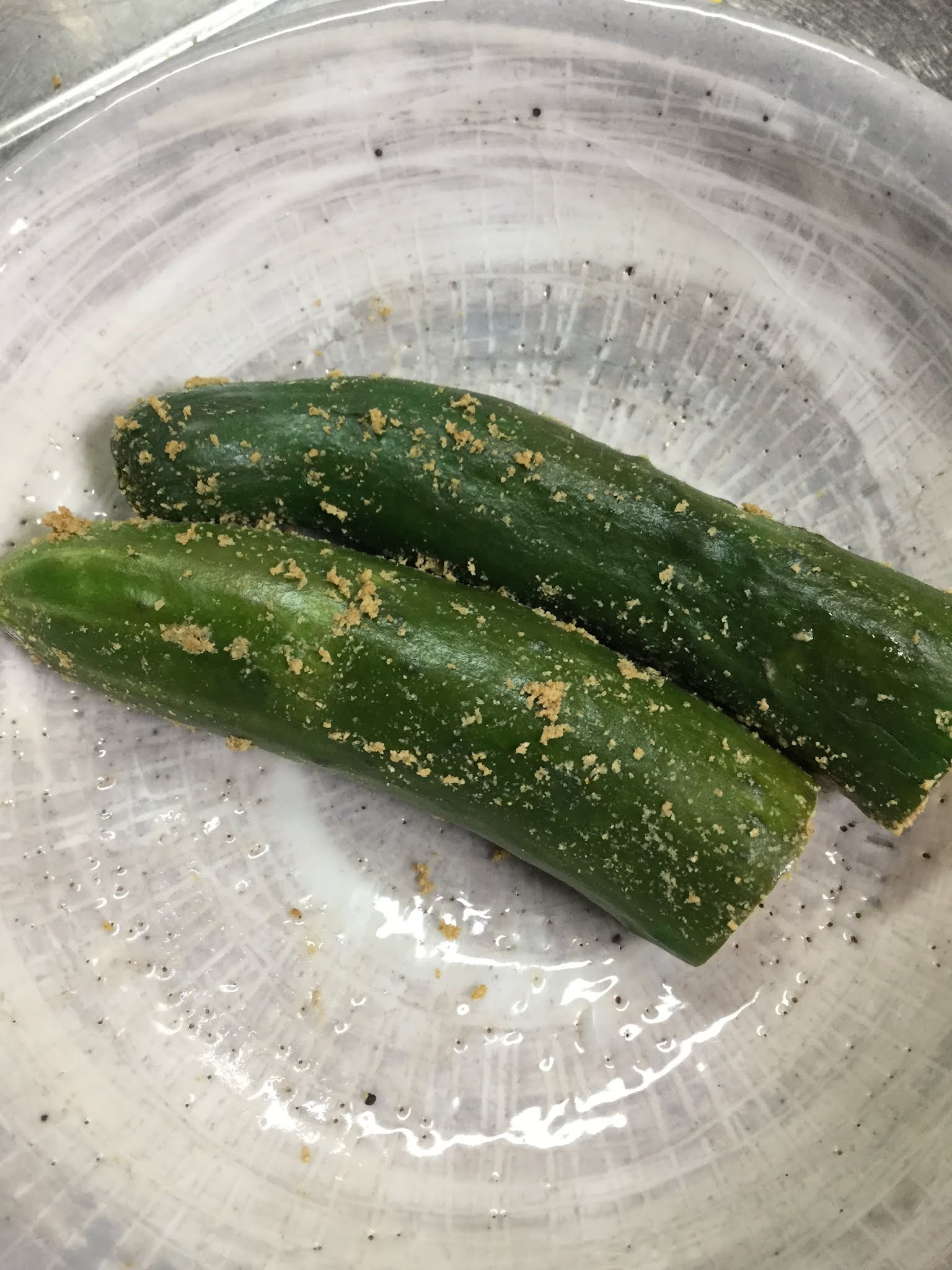 I immediately prepped another half cucumber from the landlord batch, trimming off some of the peel that was a bit scabby. What this meant, though, was that not only did I have an 'open' end on the cucumber half, but there were also some exposed places lengthwise on the cucumber. It was a recommended procedure on one of the websites I'd been reading about nukazuke, so I was curious to see how this might affect the flavor and pickling process.