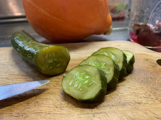 I set in another cucumber to see how things would go and took it out around 2pm. That day was full sun, and the heat settled in the house. The temperature when the cucumber went in that morning was 80°F (26°C) and 64% humidity. There was no breeze, and the air felt heavy. The resulting pickle was like the first one post-infusion: peppery and flavorful but not pungent. The cucumber itself was a vivid, polished green and the inside had a few 'watery' spots. The texture was a bit crunchy with the right amount of give. For my palette, this was a perfect pickle.