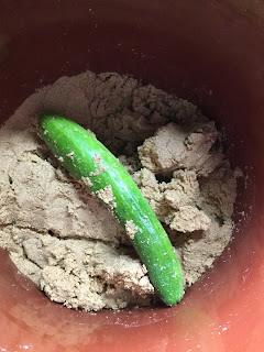 | A cucumber-turned-pickle atop my freshly infused nuka paste. |