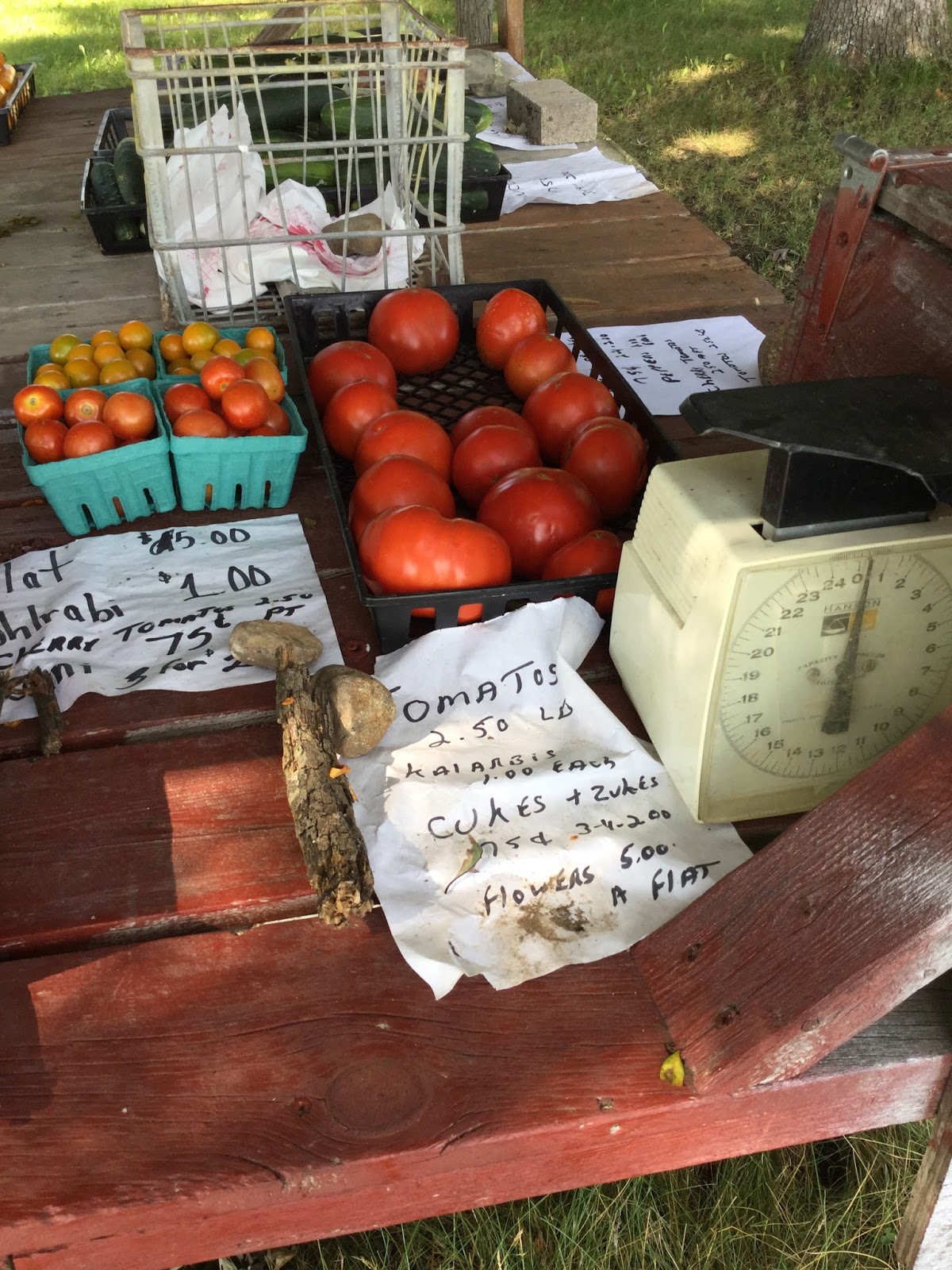 Then come the tables, and the milk crates for making a main table, the side table when we need it, and the stocking table in back. Bags paper and plastic, and the scale. Two signs – one that hangs and one that sits behind against the tree – to signal our presence and our practices, and finally us. Pint and quart containers are filled with potatoes – red and white, tomatoes regular not heirloom, beans, summer squash, and carrots. Greens go on the far end with their bunched stems to the customer for easy picking – curly, dinosaur, then Russian kale, Swiss chard and then collards - followed by beets, carrots, broccoli, cauliflower, and celery – plant or root, if we have it. Then quarts of beans nearly overflowing but not quite, line up and are stacked to tempt with their bounty, pints and quarts of potatoes red and white, large and small, followed by summer squash and cucumbers in season. The peppers jumble together here, too, with their greens, reds, and yellows, while the habeneros, cayennes red and purple, seranos, jalapenos, and tiny Thai burn quietly in a quart for 25 cents each. The watermelon sit heavily in back sending forward only one or two representatives.