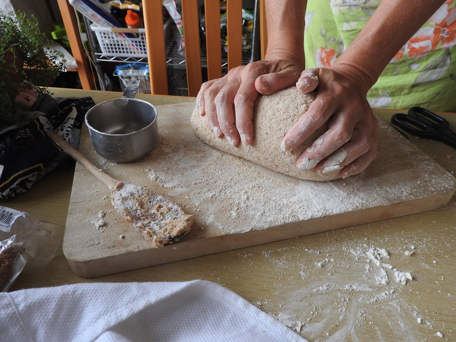 Once things seem pretty well mixed, add the flour gradually and mix thoroughly. Eventually, you will get to a point where you can barely stir. This is when you tip it out onto a floured surface and start to knead. I need for about 10 to 20 minutes, depending on how elastic the dough becomes and how good the podcast is that I'm listening to just then.