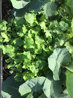 The cabbage and broccoli seedlings are lifting the row cover up some, and soon I'll have to remove it. Under their broad leaves an assortment of kales and norabo spread a green carpet that I harvest almost daily. I'd laid the dried stems from this past season's plants on the soil and let them compost. This was exactly what I had hoped for: a living, edible mulch pretty as a picture. The leaves are well nibbled by other creatures, but I'm happy to share a little.