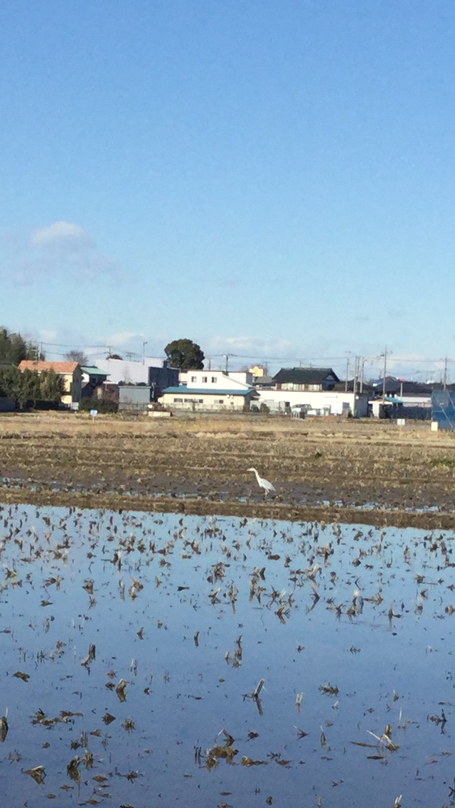 | A heron (look closely!) wandering the rice fields near Izumibashi Sake Brewery. |