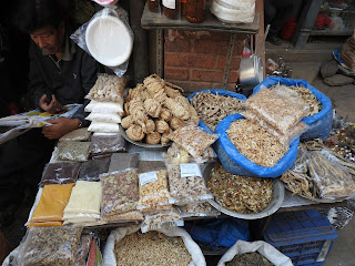 The photo above is just one I took along such a street in such an area and shows a very typical selection of dried goods. The rolled bundles in the back, though, really caught my imagination. Mulatsana (dried, ropey daikon) is just that: daikon cut into strips, sun-dried, and then coiled up for storage. It had a sort of sweet-sour taste that I could easily imagine in takari (the curry Nepali's serve with their rice and dhal) or a soup.