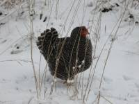 Kooretza, on the other hand, looked like she had been mugged. All but one tail feather were gone, and one eye looked a bit rough. Feather around the neck and back were missing, and her head was a bit roughed up. She ate and drank though, and clucked a bit at us.