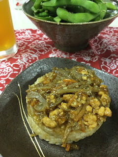 Kinpira rice burger with edamame and beer in the background.